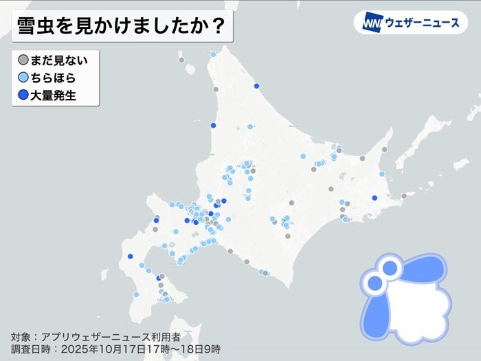 昨日は夕方近くになり、北海道から雪虫を写真に映したウェザーリポートが多く届くようになりました。そこで、ウェザーニュースでは急遽「雪虫を見かけましたか」というアンケート調査を実施。今朝までに届いた結果を集計したところ、約75%の方が雪虫を見たと回答していて、まだ見ていないという方は25%にとどまりました。