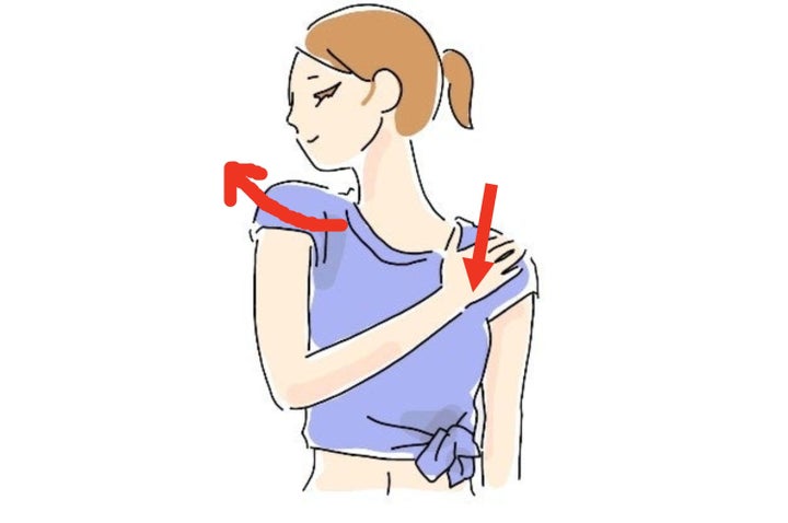 手が軽く背中に触れるくらいに左肘を曲げたら、右手で左肘を持って引っ張る。